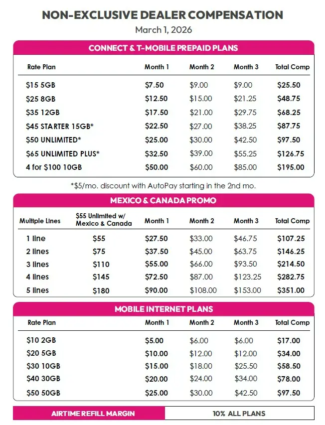 Total compensation is based on valid activation and in-store airtime refills. All commissions include the airtime margin (10%) added at the time of activation and on in-store refills. Chargebacks will apply to the Activation Commission in connection with any AT&T Prepaid activation that does not install with usage on the AT&T network.